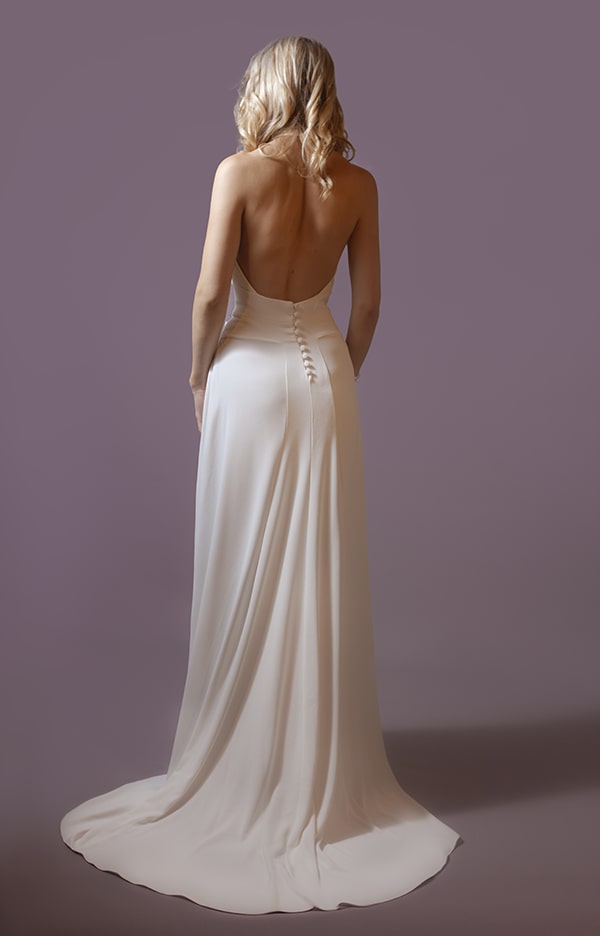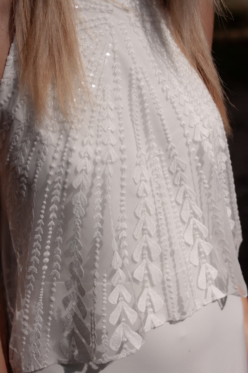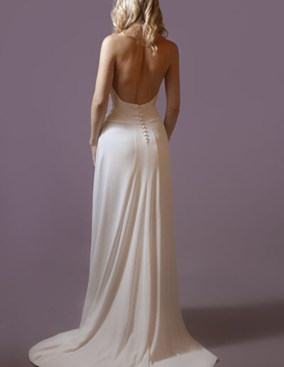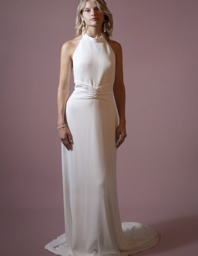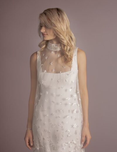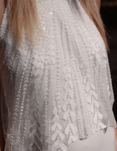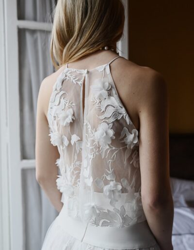 Pour créer ses silhouettes légères et raffinées, Stéphanie a une prédilection pour la soie et la dentelle, soigne les lignes des robes de mariée qu’elle veut près du corps, fluides, sans entraves pour une mariée toujours plus libre.