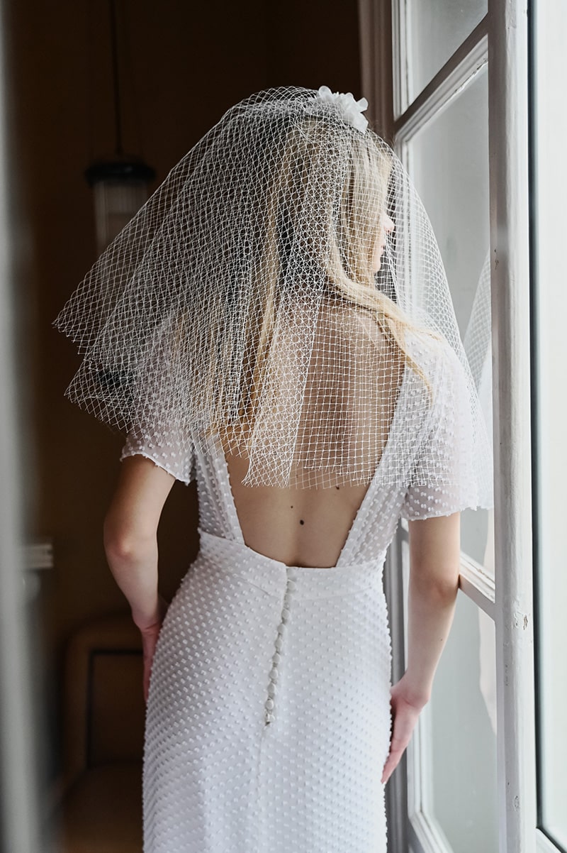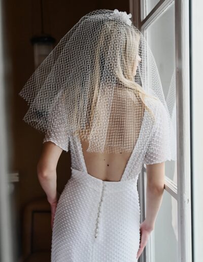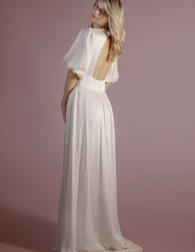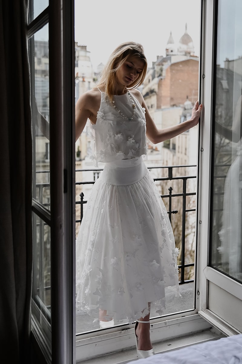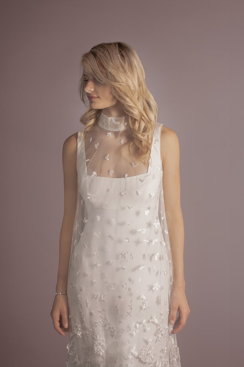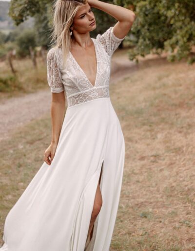 Elle propose un style affirmé cassant les codes classiques de robes de mariée pour faire « danser » des dentelles Leavers et chantilly avec des crêpes ou mousselines de soie.